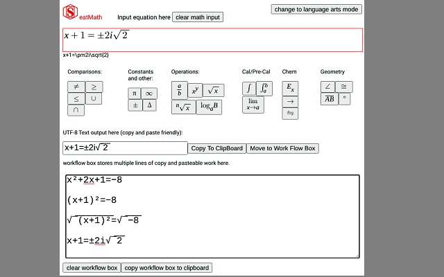 Надає можливість легко вводити математичні дані в звичайні текстові поля, як у формах Google; скласти рівняння в зручному редакторі рівнянь, а потім результат буде змінено на текст у кодуванні utf-8, який можна скопіювати в будь-яке текстове поле (включно з тестами Google Forms). Вони також можуть показати свою роботу у вікні робочого процесу та скопіювати її в буфер обміну, щоб вставити в запитання у формах Google, яке налаштовано на отримання відповідей на абзаци. Це дозволяє учням працювати безпосередньо з формами замість того, щоб вставляти URL-адреси до зображень своїх відповідей.
